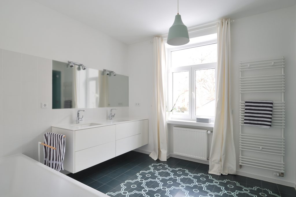 Sämtliche im Zuge der Neuordnung abgebrochenen Wände wurden durch Stahlträger und -stützen ersetzt; neue Trennwände entstanden in Trockenbauweise. Beim Verlegen der Fußbodenheizung im Erdgeschoss wurde der fehlende Unterbau entdeckt – eine Bodenplatte musste nachträglich erstellt werden. Das undichte Dach wurde instand gesetzt, der marode Fassadenputz in seiner historischen Struktur rekonstruiert. Die Haustechnik wurde komplett erneuert mit einer Gas-Brennwert-Heizung und umfassender neuer Elektro-Installation. Die neuen Bodenbeläge verbinden geölte, handgehobelte Eichen-Landhausdielen mit ornamentierten Zementfliesen und Glasmosaik und setzen einen individuellen, handwerklich geprägten Akzent im sanierten Bestand.