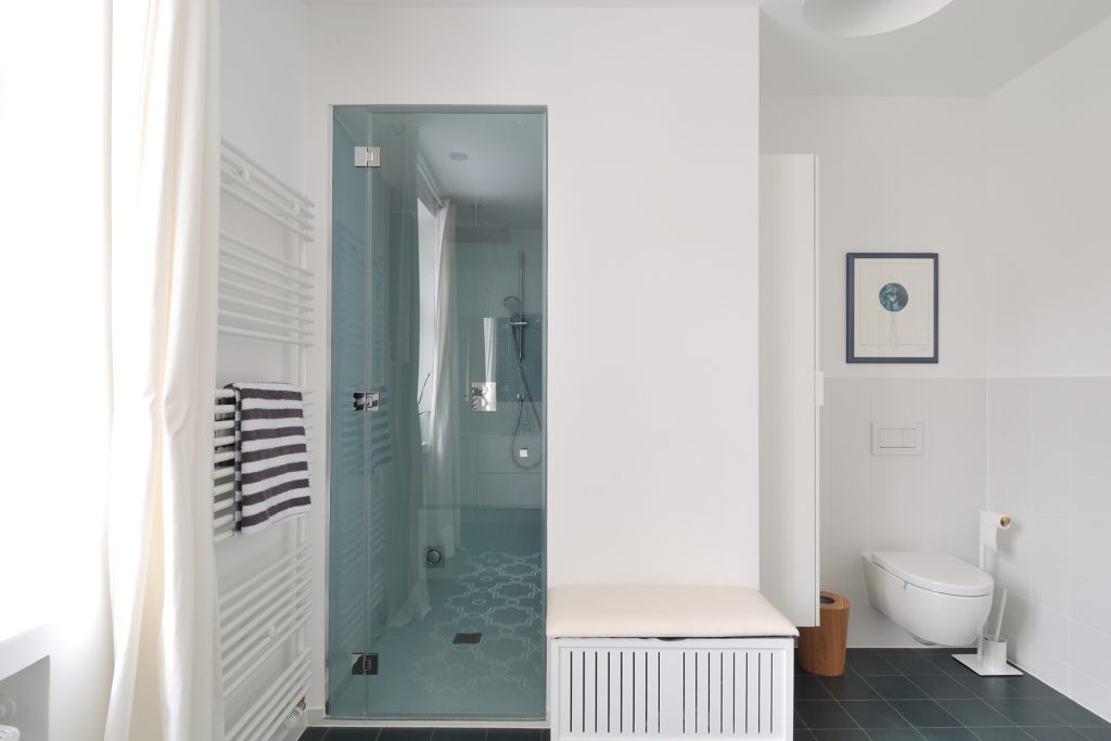 Eine zusätzliche interne Treppe führt ins Obergeschoss zu den neuen Kinderzimmern und dem großzügigen Schlafbereich mit angegliederter Ankleide. Im Masterbad wurde eine individuelle Dampfdusche installiert und Badezimmermöbel eingebaut, die nach den Wünschen der Bauherren entwickelt und produziert wurden.