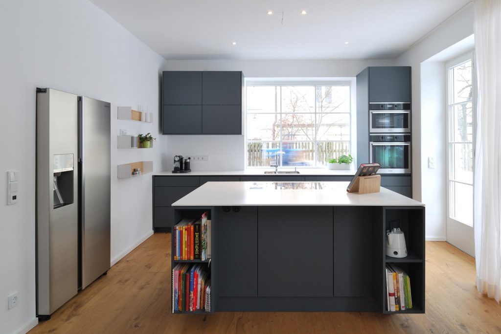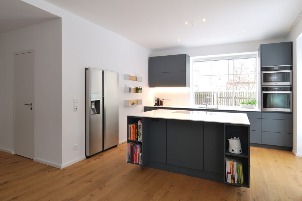 Das 1900 errichtete Wohnhaus in der historischen Villenkolonie München-Gern wurde einer umfassenden Generalsanierung unterzogen. Erd- und Obergeschoss wurden zu einer zusammenhängenden Wohneinheit verbunden und die ursprünglich verschachtelten Grundrisse neu geordnet. Im Erdgeschoss entstand ein offener Wohn-, Ess- und Kochbereich, der über neue dreiflügelige Terrassentüren direkt mit dem Garten verbunden ist. Die Küche wurde bis ins Detail nach den Vorstellungen der Bauherren geplant, individuell vom Schreiner gefertigt und passgenau eingebaut.